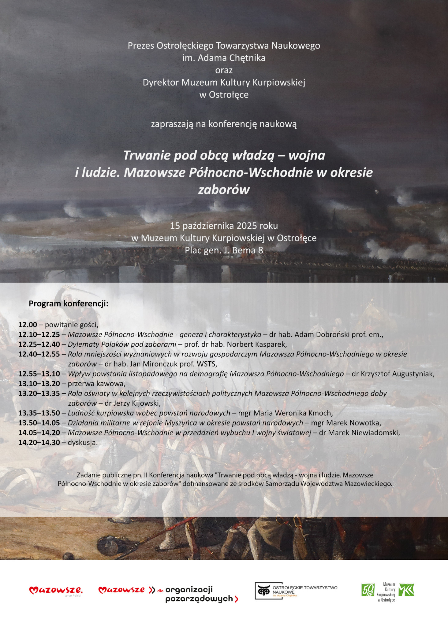 Prezes Ostrołęckiego Towarzystwa Naukowego im. Adama Chętnika oraz Dyrektor Muzeum Kultury Kurpiowskiej w Ostrołęce zapraszają na konferencję naukową pt. „Trwanie pod obcą władzą – wojna i ludzie.