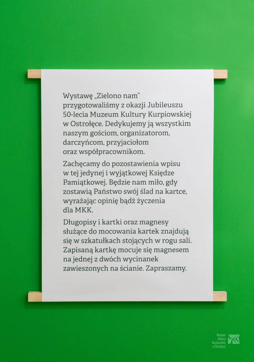 15 września, w ramach wydarzeń jubileuszowych 50-lecia Muzeum Kultury Kurpiowskiej, po raz pierwszy światło dzienne ujrzała wystawa „Zielono nam”. Od wczoraj ekspozycja jest dostępna dla zwiedzających, a oglądać ją oglądać do 1 lutego 2026 roku. Serdecznie zapraszamy.