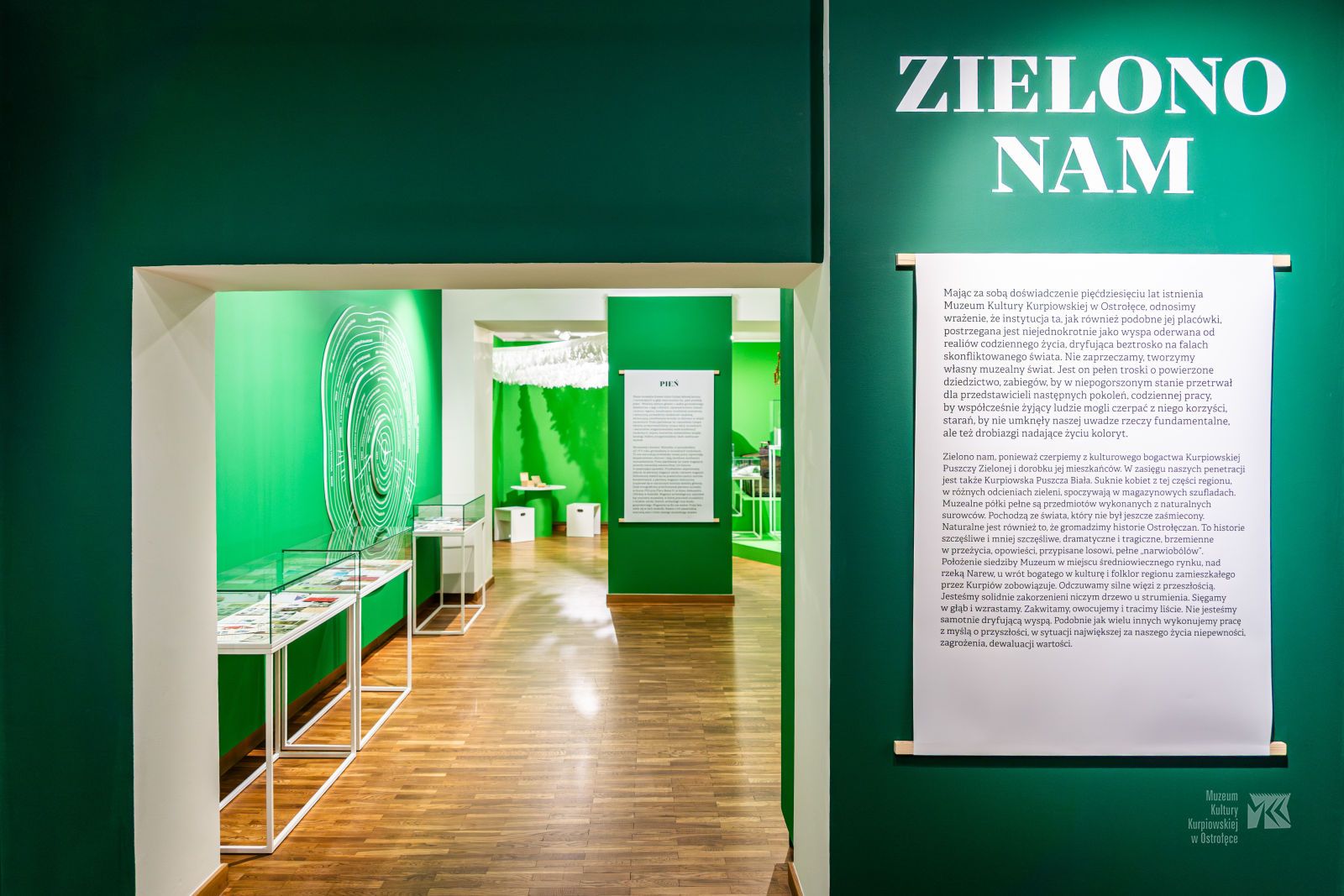 Nadaliśmy tej wystawie tytuł „Zielono nam”. Mogę tylko przypuszczać, że zastanawiają się Państwo, czy jest nam zielono i dlaczego. Jest nam zielono, ponieważ czerpiemy z kulturowego bogactwa Puszczy Zielonej i dorobku Kurpiów. W zasięgu naszych zainteresowań jest Puszcza Biała. Suknie kobiet z tego regionu, w różnych odcieniach zieleni, spoczywają w magazynowych szufladach. Wiemy, jaki wysiłek kryje się za wytworzeniem codziennej koszuli lnianej. Zachwycają nas pieśni leśne Kurpiów, spódnice rodem z kosmosu, wstawki starych tkanin w strojnych kieckach, ładne jeglije, zielonoskrzydłe motyle. Znamy drogę od ziarna do materii, naznaczoną całorocznym trudem mężczyzn i kobiet. Nie dziwimy się, dlaczego szanowano najprostsze rzeczy. Z pieczołowitością przekładamy skamieliny z plejstocenu, lateńskie narzędzia i trzeciorzędowe bursztyny – złoto tej ziemi.